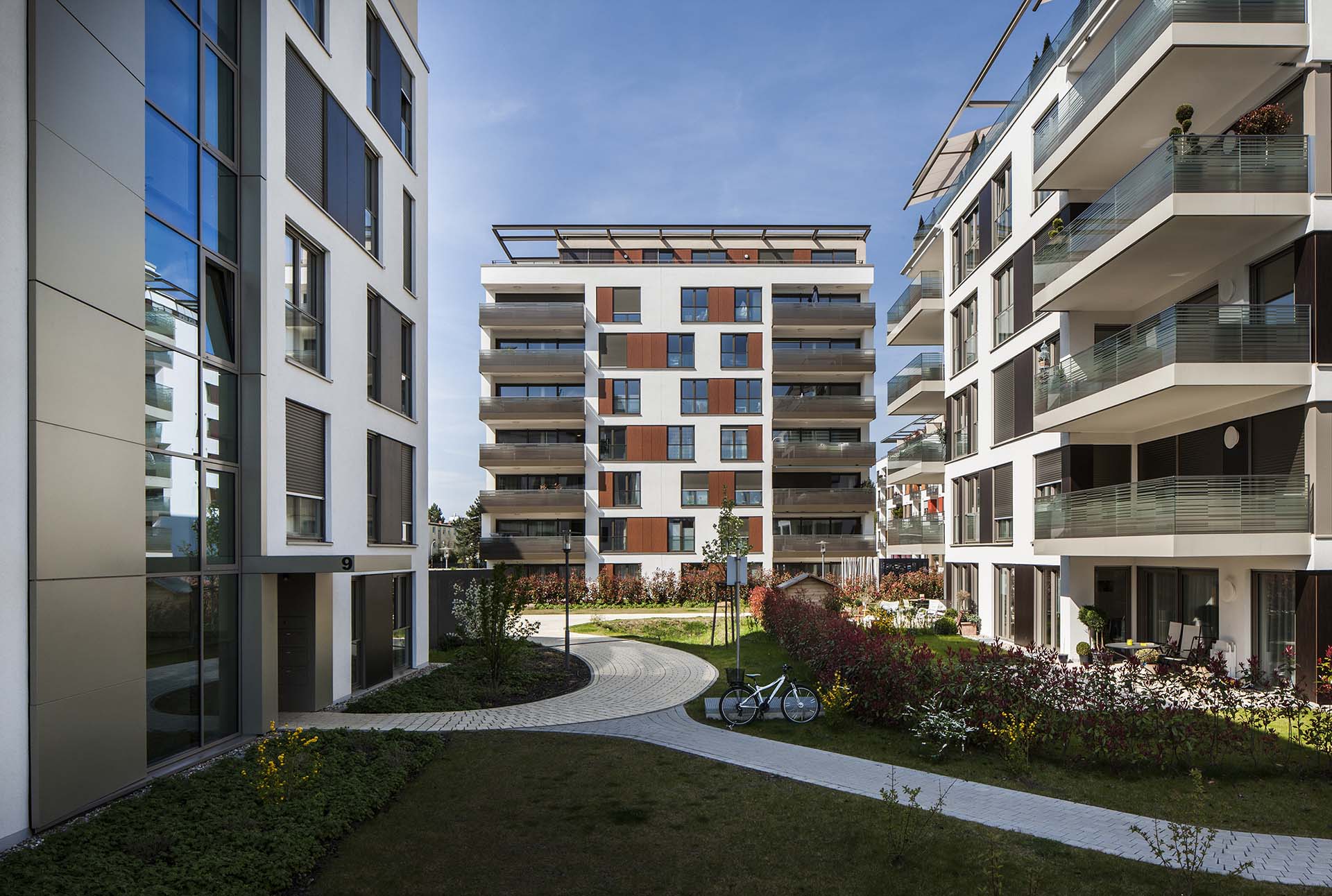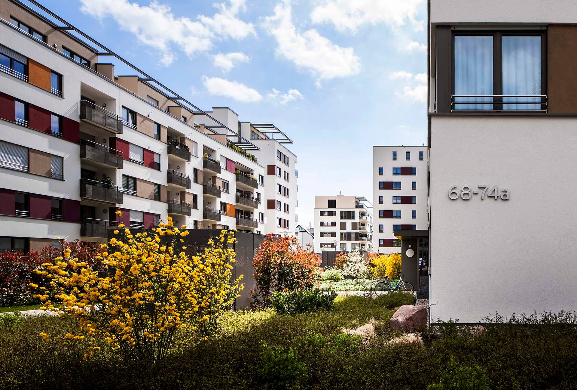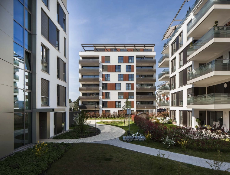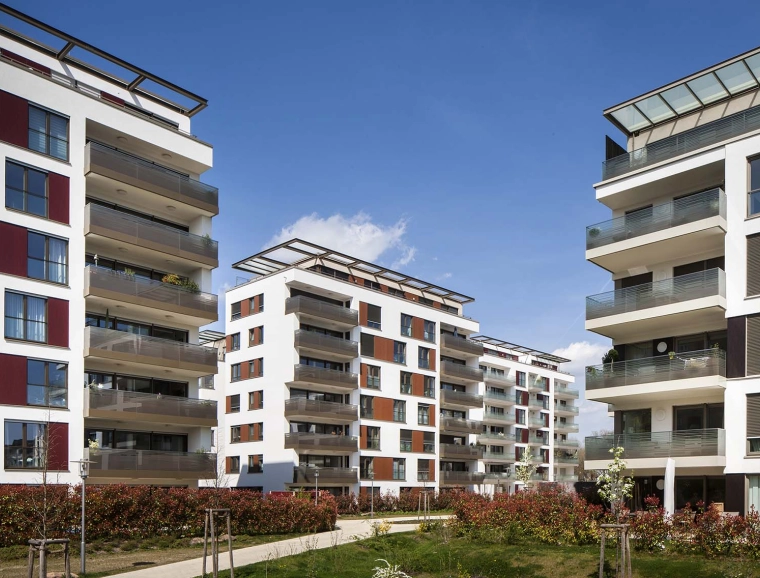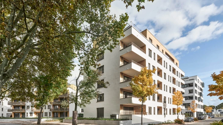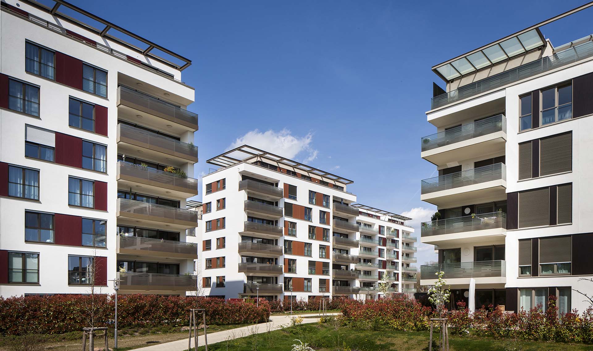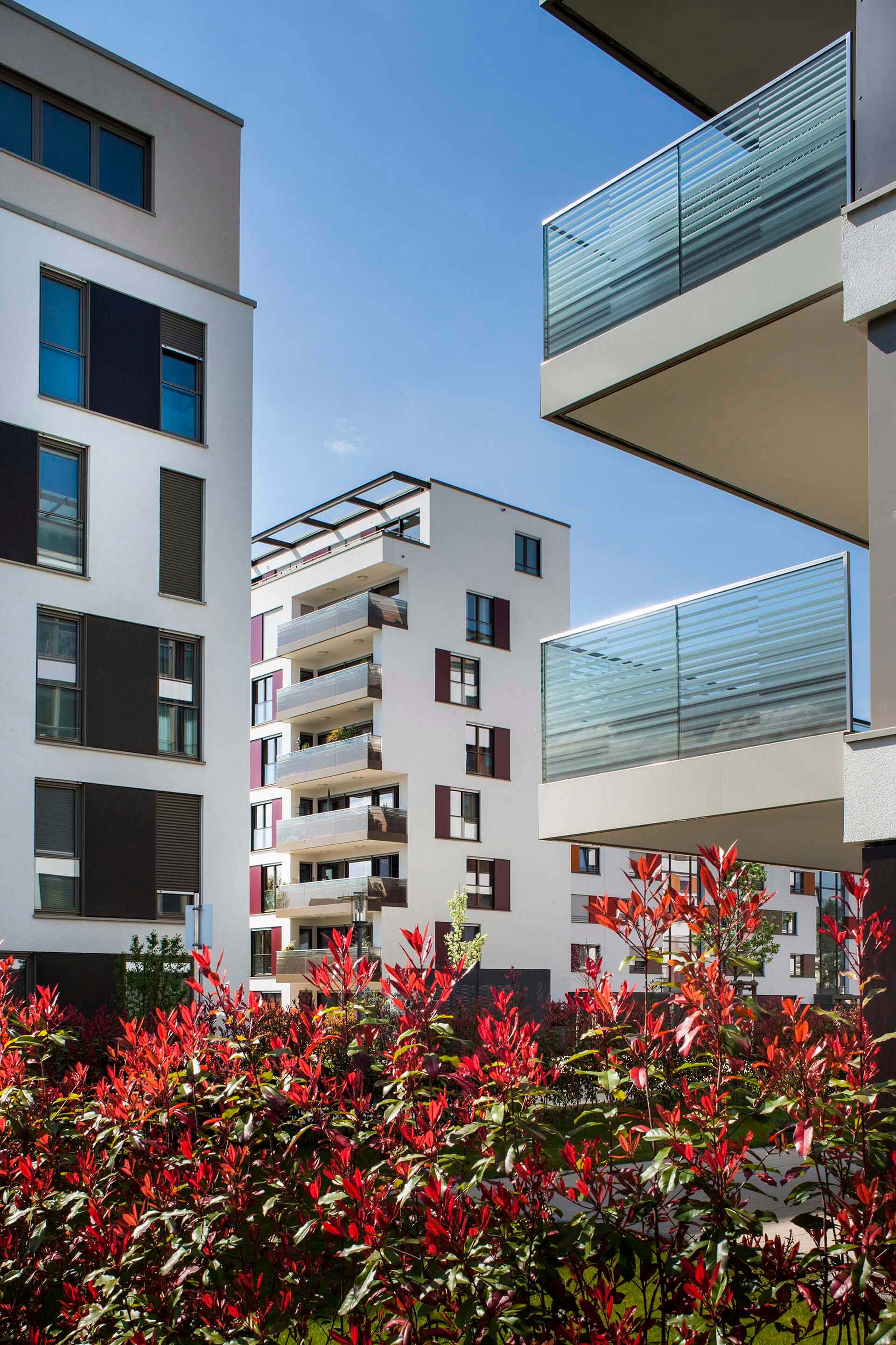 Die Architektursprache von blocher partners vermittelt dem Betrachter eine hohe Ästhetik und unaufdringliche Eleganz. Sensibel wurden die Gebäudekörper in Form und Gestaltung aufeinander abgestimmt und perfekt angeordnet. Großflächig angelegte Fensterpartien und verglaste Balkonbrüstungen verleihen den Wohnhäusern eine besondere Transparenz und Leichtigkeit.