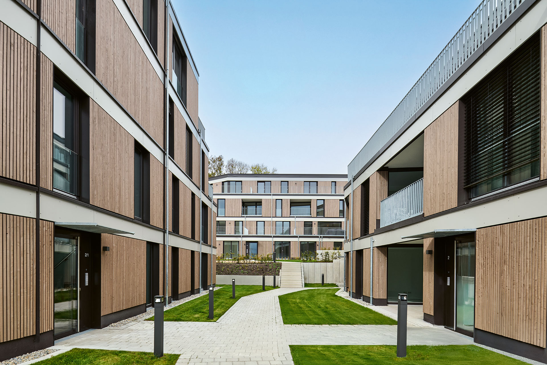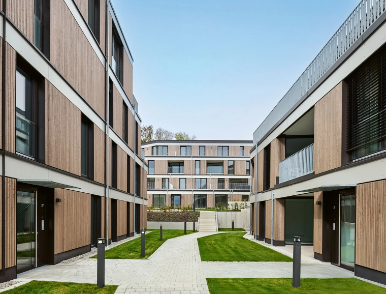 Die Stahl-/Betonkonstruktion ist mit einer Fassade aus vertikalen Holzlamellen mit integrierter Wärmedämmung verkleidet, der begrünte Flachdachaufbau wird mit Photovoltaikanlagen versehen. Der nachhaltige Anspruch in Kombination mit einer hohen Aufenthaltsqualität, die sich durch eine attraktive, naturnahe Freiraumgestaltung ergibt, spricht Singles und Paare ebenso an wie Familien und Senioren.