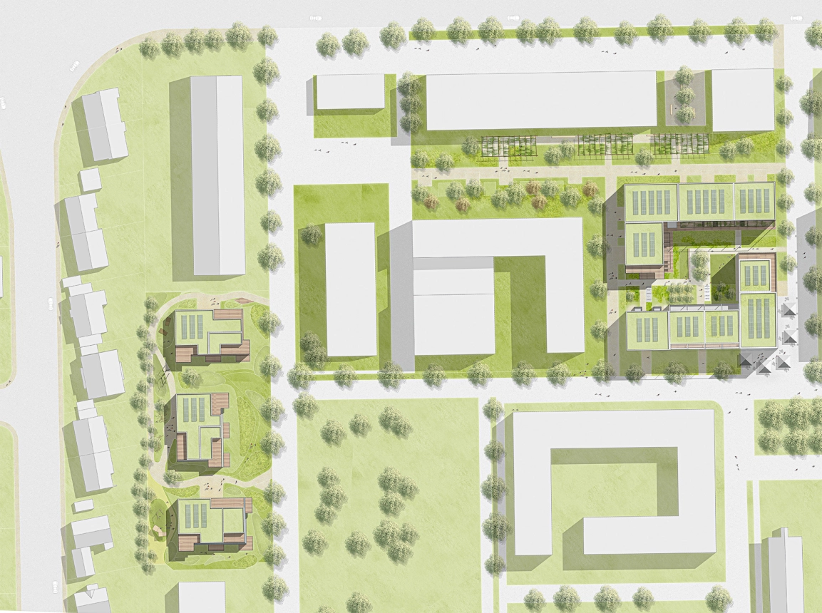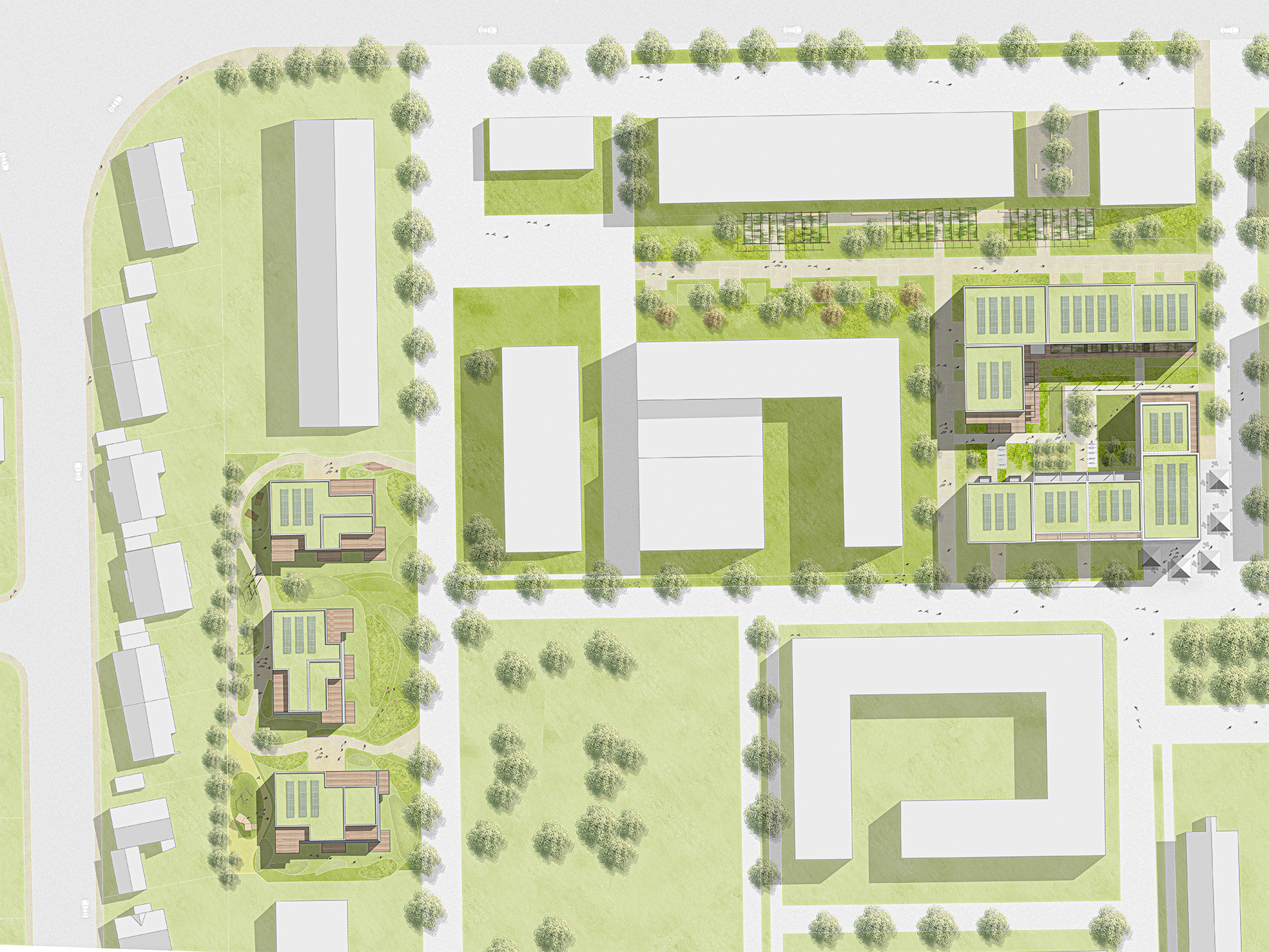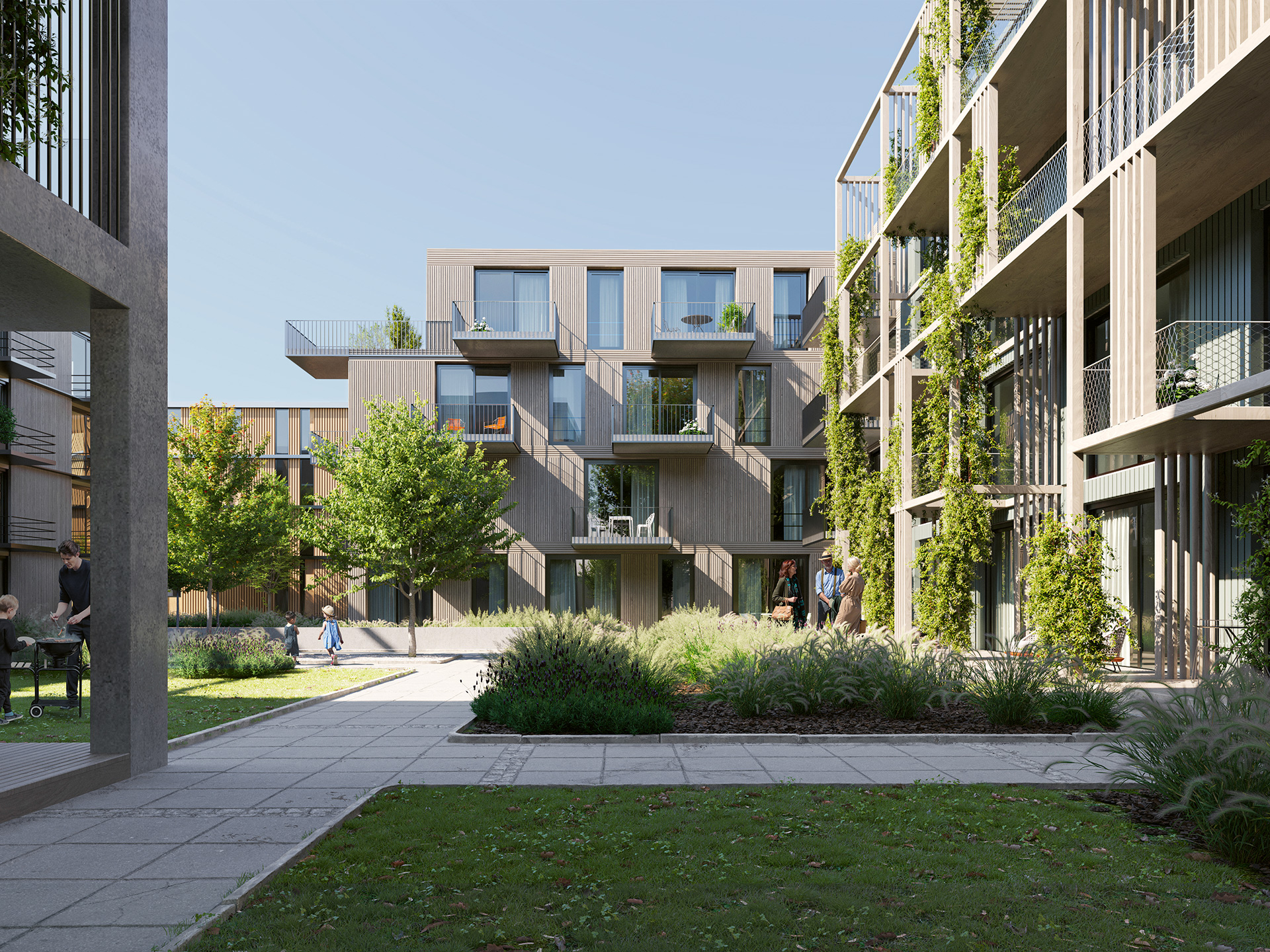 Die Konversionsfläche US-Hospital soll sich zu einem autofreien Quartier mit ausgewogenem Wohnungsangebot und hoher Aufenthaltsqualität entwickeln. Nachhaltigkeitsaspekte spielten bei dem Wettbewerbsentwurf für einen Wohnhof sowie drei Punkthäuser eine wichtige Rolle. Als Hauptbestandteil der Konstruktionen wird Holz verwendet; der hohe Grad an Vorfertigung erlaubt zudem eine deutlich verkürzte Bauzeit.
