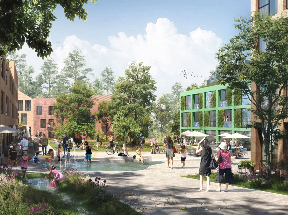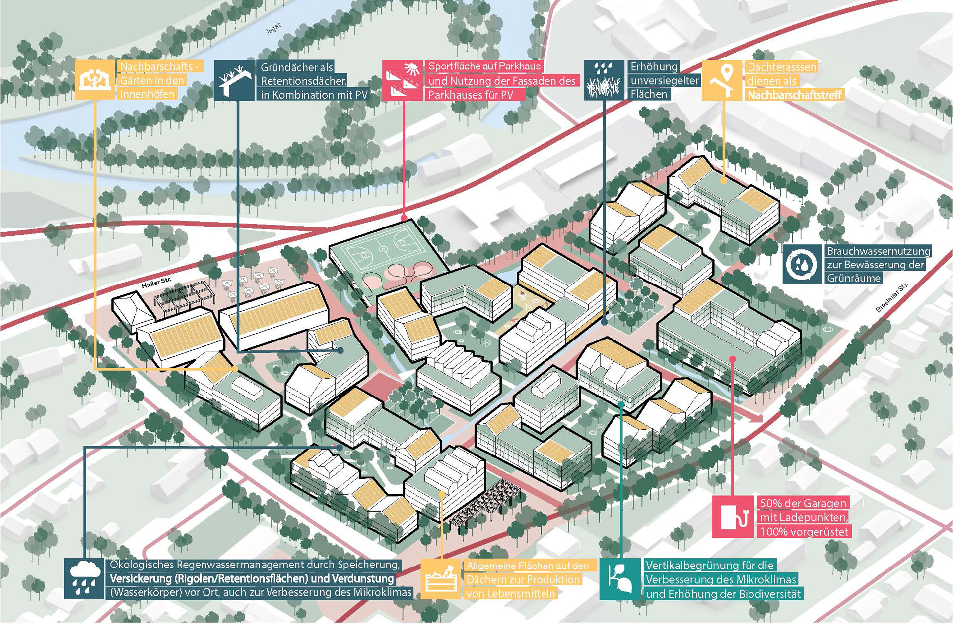 Unter diesem Leitbild entwickelt sich eine Struktur aus sechs einzelnen Nachbarschaften, die mittels einer übergeordneten Freiraumplanung zu einem neuen innovativen, nachhaltigen Stadtquartier vernetzt werden. Der Wettbewerbsentwurf übersetzt die vorhandenen Potentiale bestehend aus freistehenden Gebäuden mit Garten und Grünflächen in ein neues Muster, das seinen Bewohnern einen qualitätsvollen Lebensraum bietet.