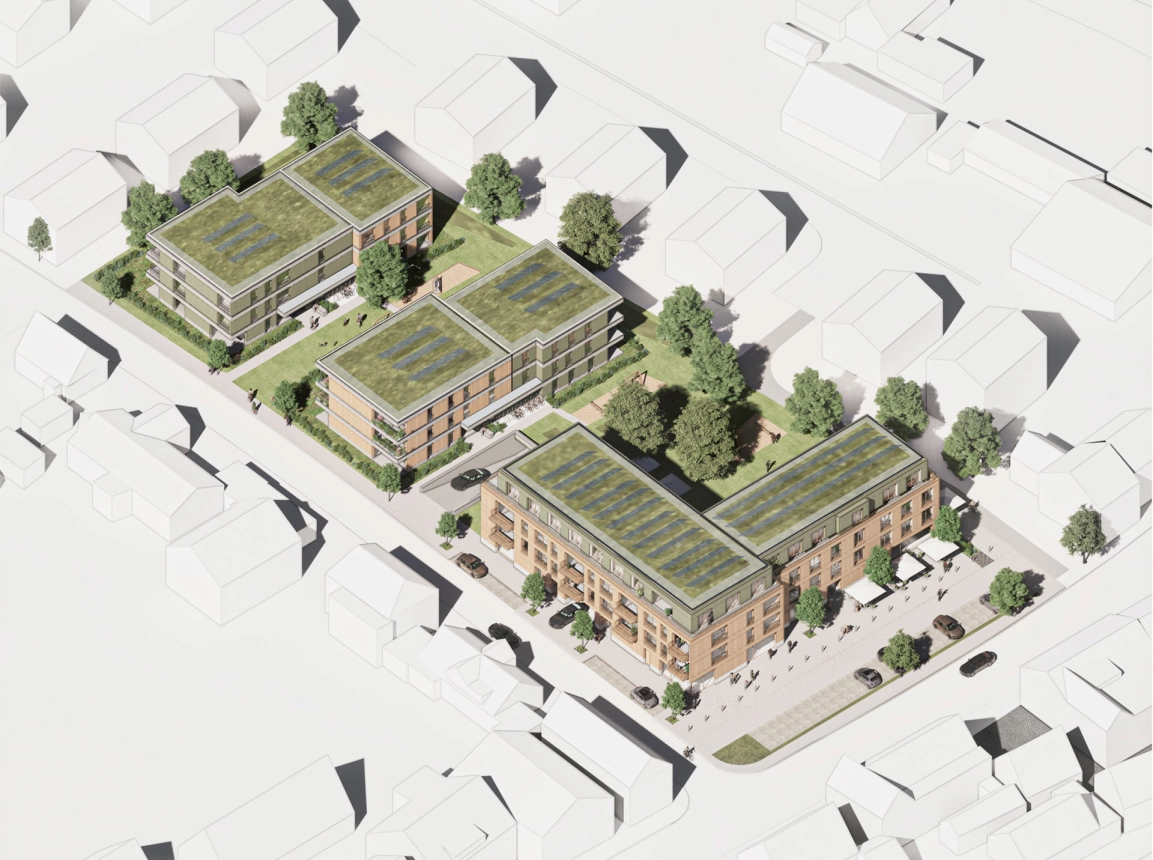 Leitgedanke des Entwurfs ist, ein unter architektonischen, sozialen und ökologischen Gesichtspunkten nachhaltiges Areal zu schaffen, das einen beispielgebenden Baustein in der Entwicklung des Ortes bildet. Gleichzeitig soll sich das neue Wohnquartier mit 60 Wohneinheiten in stimmiger Maßstäblichkeit und Formensprache in die gewachsene Gemeindestruktur eingliedern.