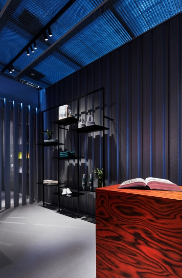 Die Volumen sind so arrangiert, dass sie zwei große Zugänge zum zentralen Marktplatz bilden, der mit Sitzgelegenheiten und Bar schon von Weitem als lebendiger Mittelpunkt des Messestandes wahrgenommen wird. Hier nimmt sich der gebaute Raum, der durch die Außenwände der vier Welten gebildet wird, zurück und schafft durch seine dunkle Farbgestaltung eine Bühne für die Lichtgestaltung.