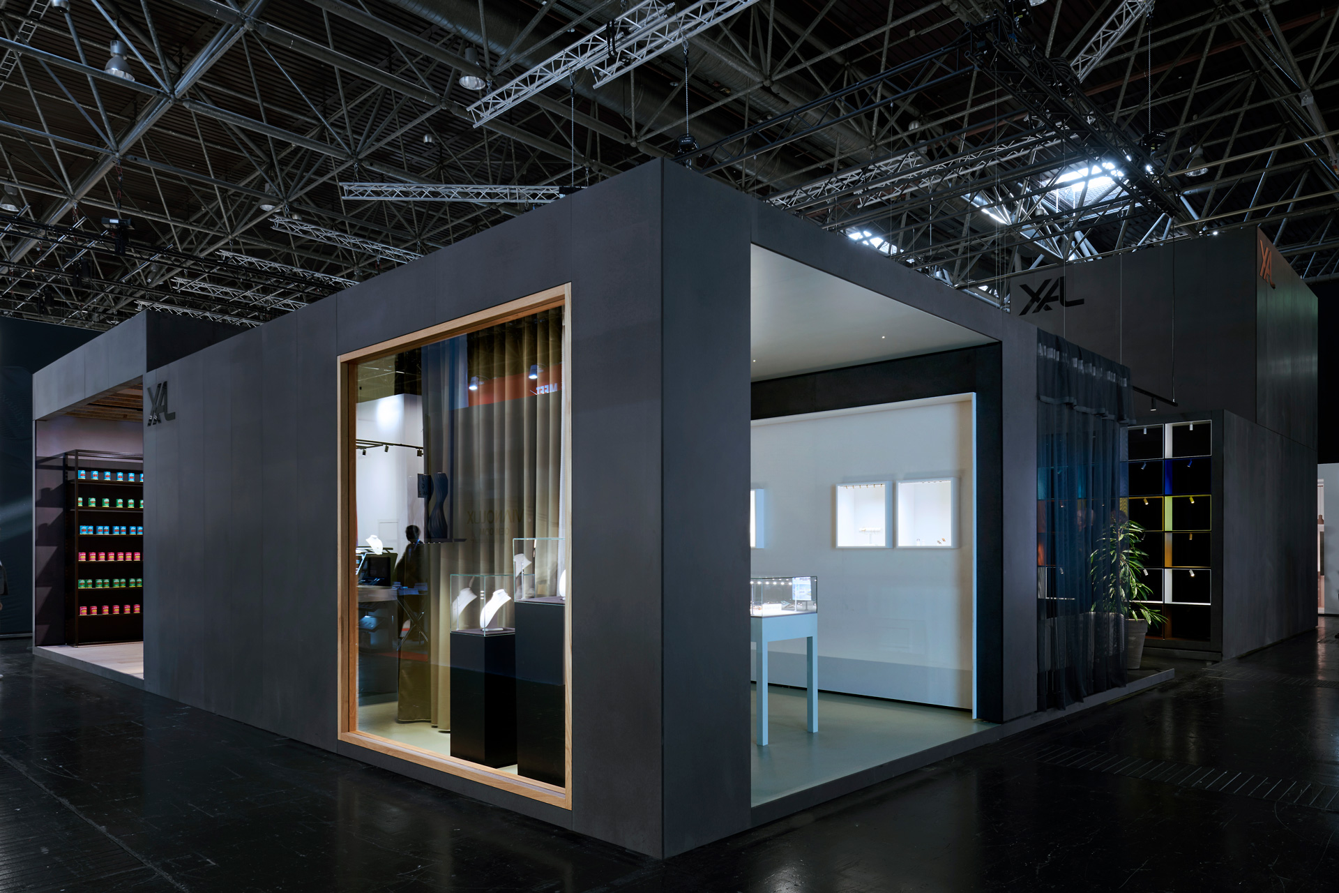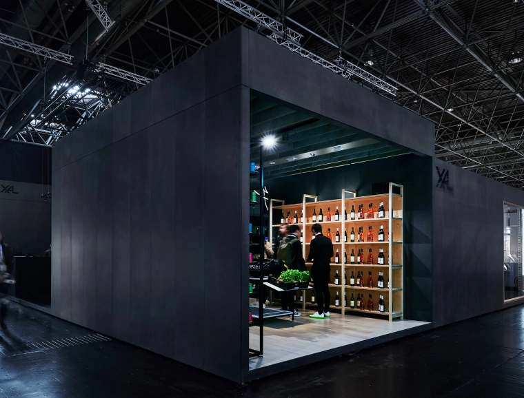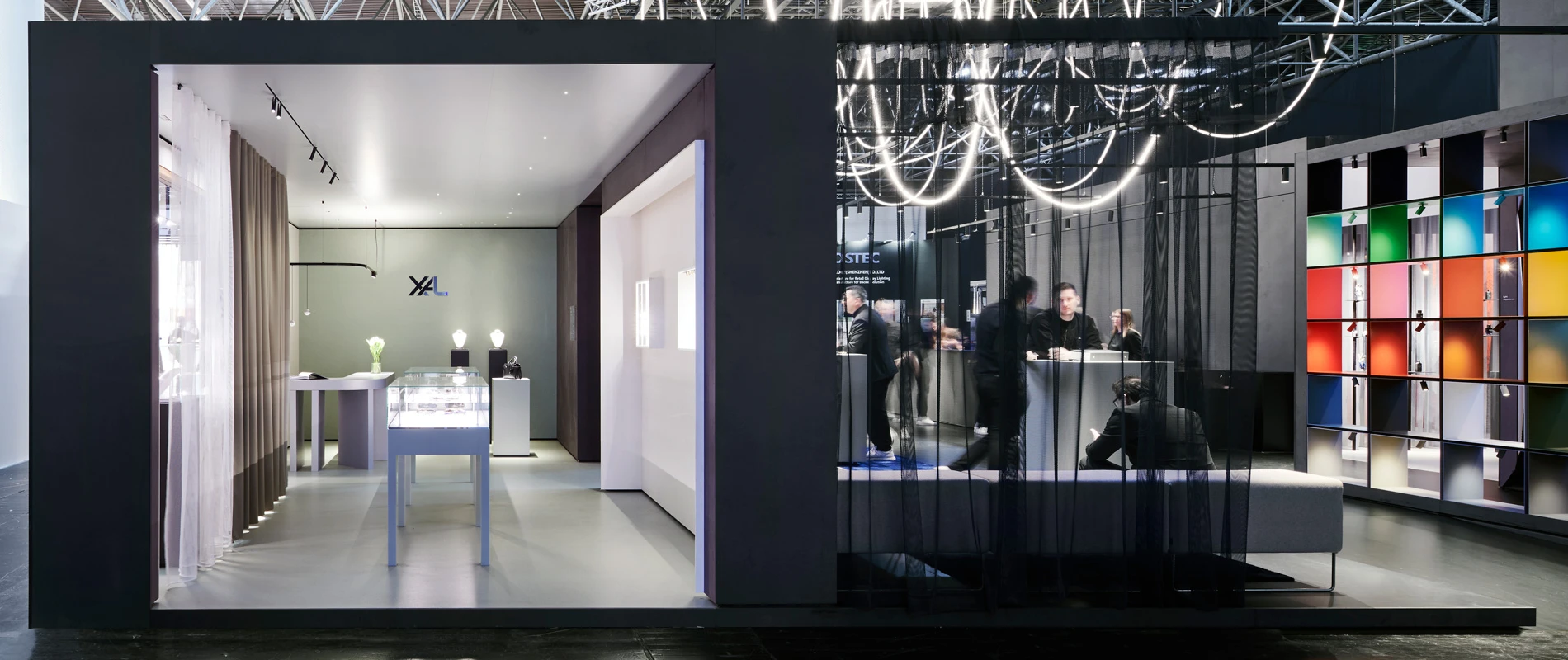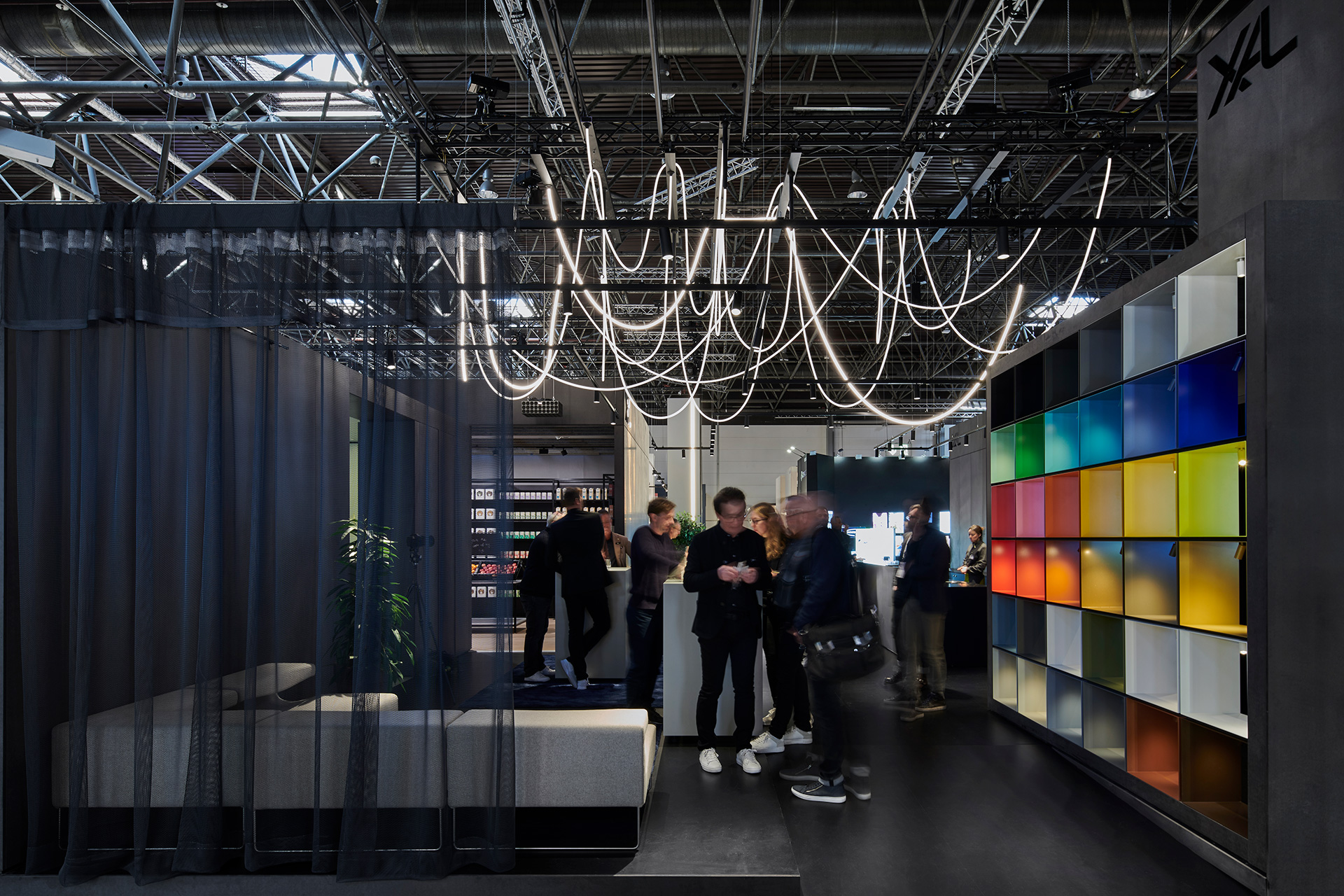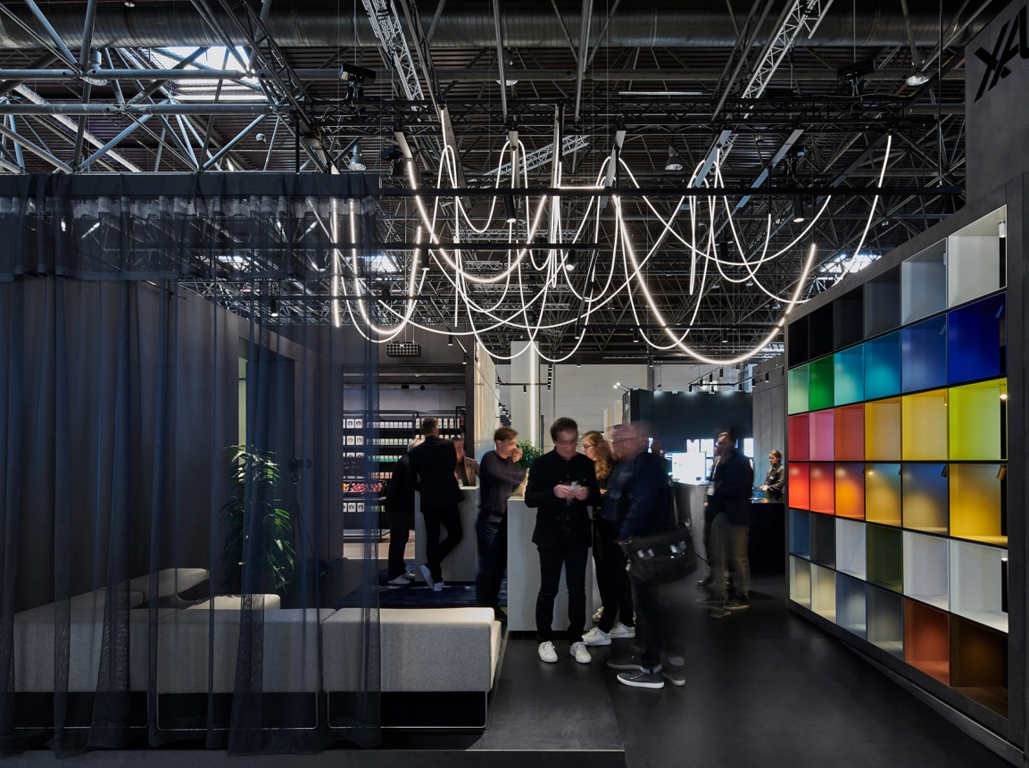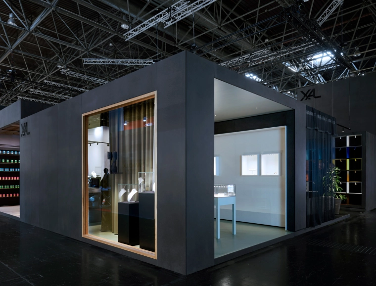 Der Messestand zeichnet sich durch einen durchdachten Rhythmus von Innen und Außen aus. Schon vor Betreten des Messestandes sorgen die einzelnen Welten durch großzügige Einblicke sowie Blickbeziehungen für eine anziehende Wirkung. Das Spiel mit verschiedenen Raumhöhen spiegelt reale Raumszenarien wider und gipfelt in der knapp sechs Meter hohen Experiencewelt; eine räumliche Interpretation der Markenphilosophie und des Innovationsgedankens von XAL: »Lighting without limits.«